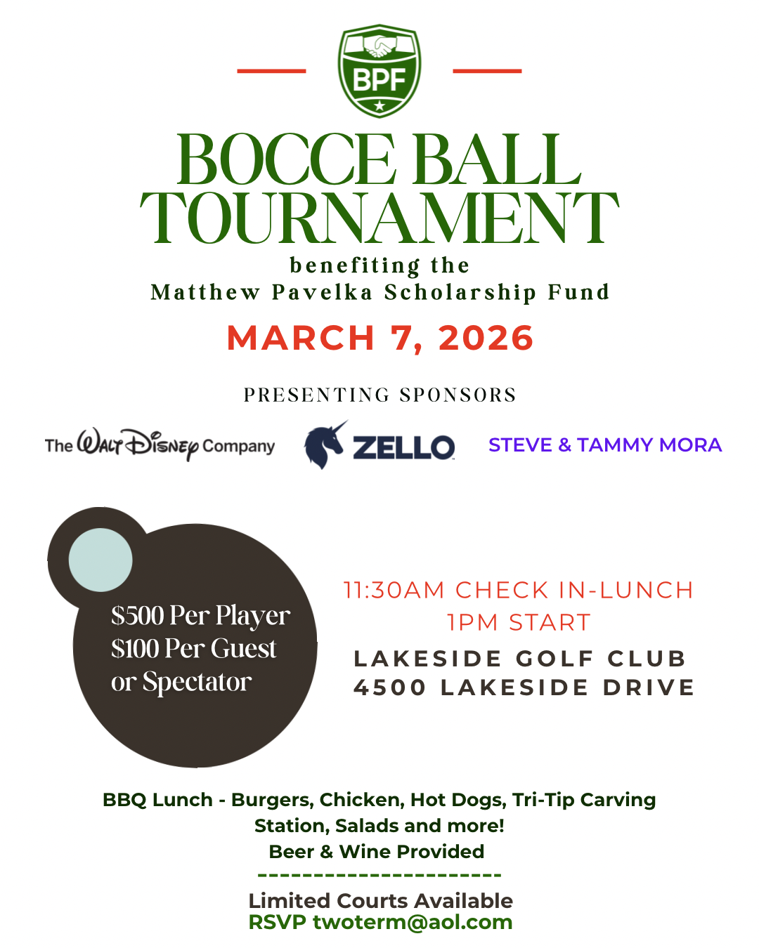 The Burbank Police Foundation Bocce Ball Tournament is an annual fundraising event to support the Matthew Pavelka Scholarship Awards Program. The Purpose of the Matthew Pavelka Scholarship Fund is to provide an award for high school seniors who have demonstrated outstanding effort in pursuit of a vocational or educational goal, to motivate students to dedicate themselves more thoroughly and responsibly to their education or training and to encourage students to strive for excellence and distinction in whatever they undertake. In the process, we hope to give back to the community which supports us, as well as keep Matt’s memory alive.